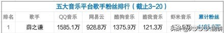 五大音乐平台粉丝数排行,薛之谦4186万粉丝量排第一