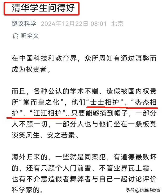首医大校长,饶毅面对这个事情的又发文开炮。他盛赞清华学生问得好,并且痛斥国内学术圈的“士士相互”“杰杰相互”“江江相互”等等不良行为。