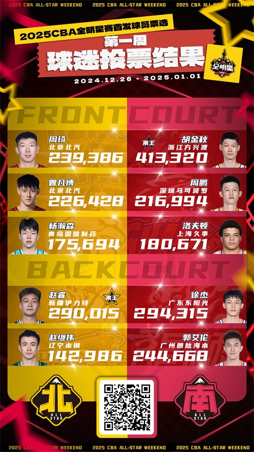 徐杰(294315)、郭艾伦 (244668)、胡明轩(225590)、孙铭徽 (166116);胡金秋当选第一周南区票王。