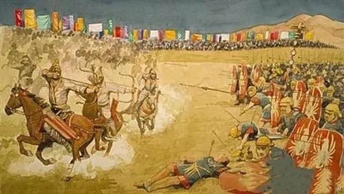 就弓箭来说,罗马弓箭手的射程是50米左右,而改良后的帕提亚轻弓骑兵射程有150米,帕提亚的轻弓骑兵在罗马步兵射程范围外发动了攻击,弓箭如雨点一般落到了罗马士兵的头上,罗马士兵举着盾牌强忍着对方的攻击,他们以为弓箭放完了就会停止,但是帕提亚轻弓骑兵射完了就回去拿弓箭,再返回继续放箭,持续没完没了的放箭最终使罗马人的方形阵溃散了。