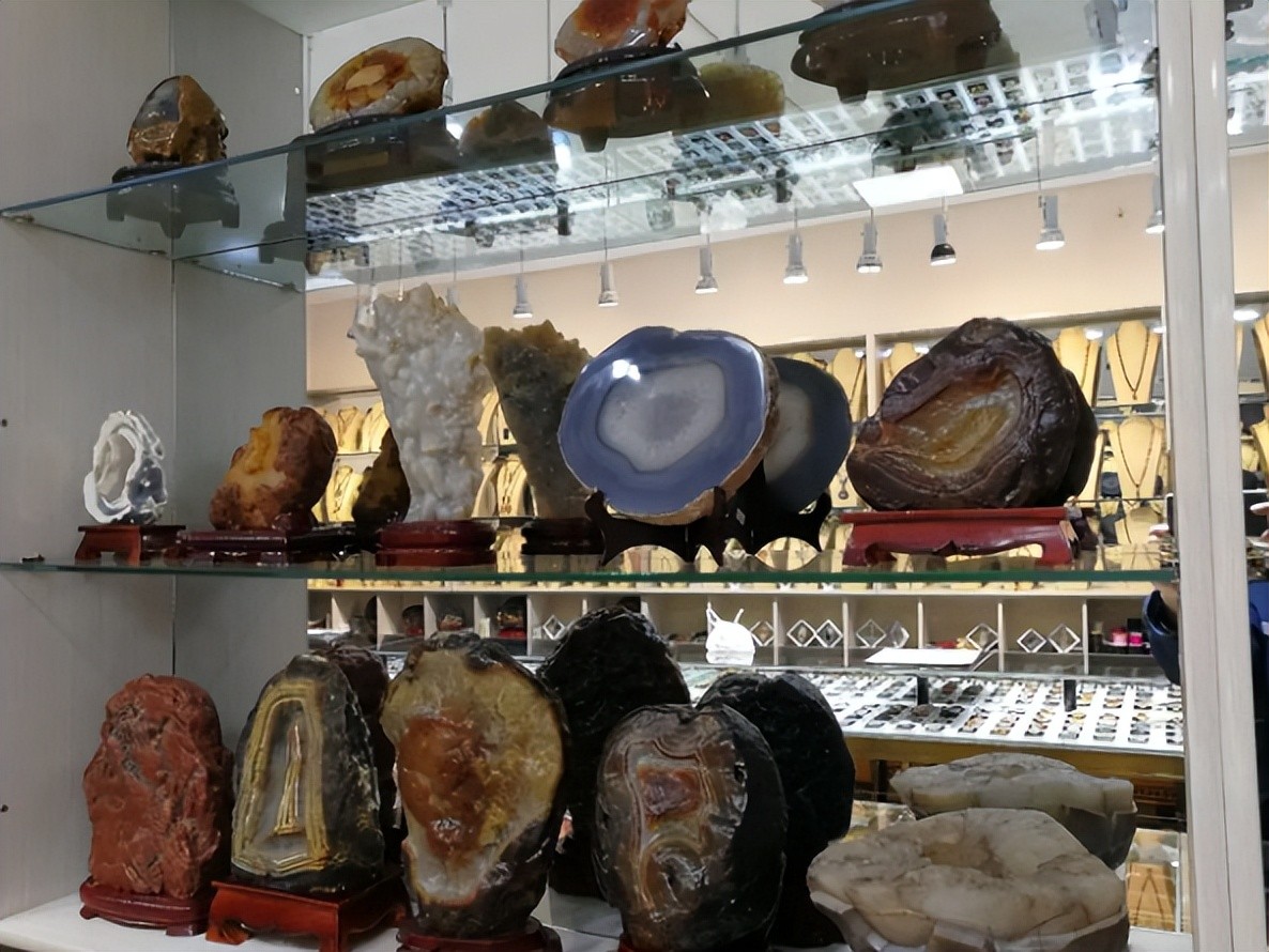据统计,玛瑙湖附近巴彦淖尔市已有数千家奇石店铺。当地的牧民们也开始经营奇石店,做起石头生意。