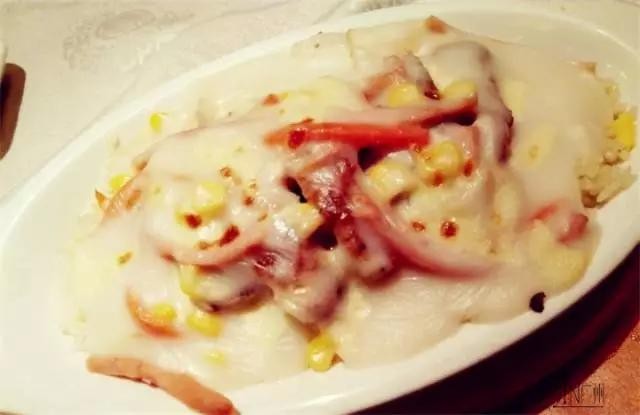 有一道白汁火腿芝士焗猪扒饭,芝士控对于焗饭都是不可控的。这焗饭的分量,真的是要感动地哭了,一上饭时浓浓的芝士和奶油味,猪扒又厚实大块,还有不少火腿丝。真的觉得物美价廉,性价比极高。