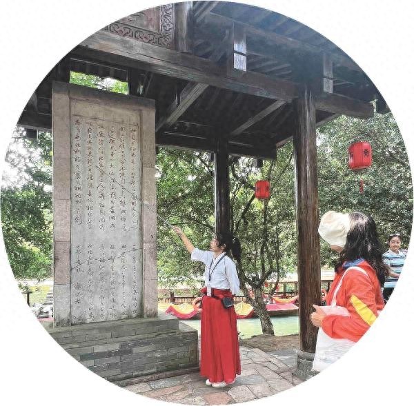 灵渠讲解员在讲解郭沫若游览灵渠时写下的《满江红·灵渠》。记者谭熙 摄