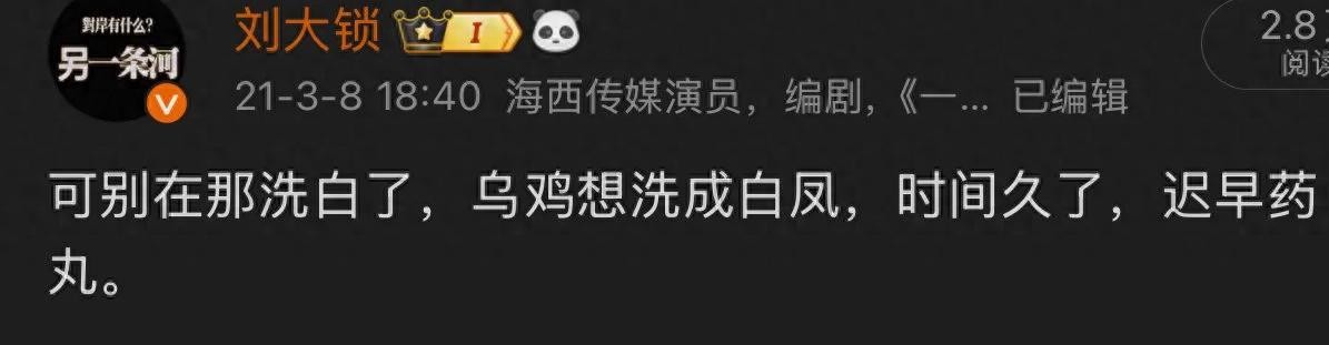 1月25日,刘大锁在社交媒体上发文,配图是他2021年发的一条动态:“可别在那洗白了,乌鸡想洗成白凤,时间久了,迟早药丸”。这一动态被众多网友认为是在疑似内涵张大大,将曾经闹得沸沸扬扬的“小黑屋”事件再次推到了公众面前。
