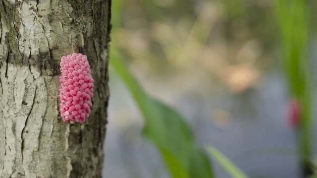 福寿螺卵是福寿螺生命周期的一部分,它们通常呈红色或粉红色,外观类似于水果。这些卵通常会被福寿螺母体沉积在水域中的植物表面、岩石、建筑物或其他硬表面上。每个卵团内包含数十到数百个卵,这些卵在孵化后会释放出小型的福寿螺幼虫。