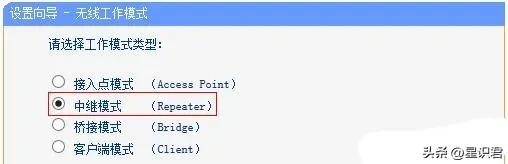 2、在无线工作模式下选择“中继模式”,点击“下一步”。