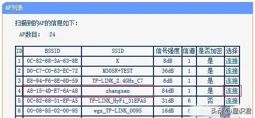 4、在ap列表(扫描页面)中找到主路由器的SSID,点击“连接"。