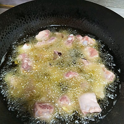3、油热依次放排骨下锅。首先开大火炸,记得要翻面哟。 两面炸至稍微金黄后转中火炸。