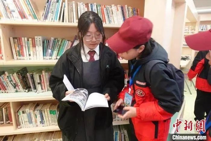图为香港培侨中学学生(左)向福建希望工程“看世界”筑梦研学营学生(右)介绍学校图书馆。中新网记者 刘大炜 摄