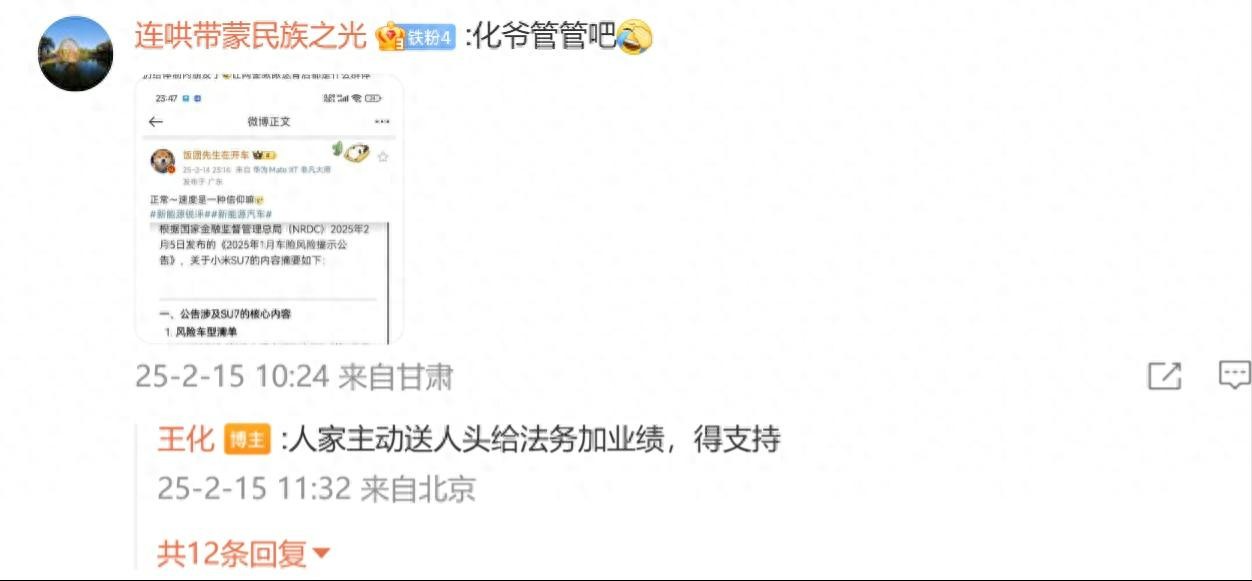 王化回应:“人家主动送人头给法务加业绩,得支持!”直接点破造谣者“求锤得锤”的结局。