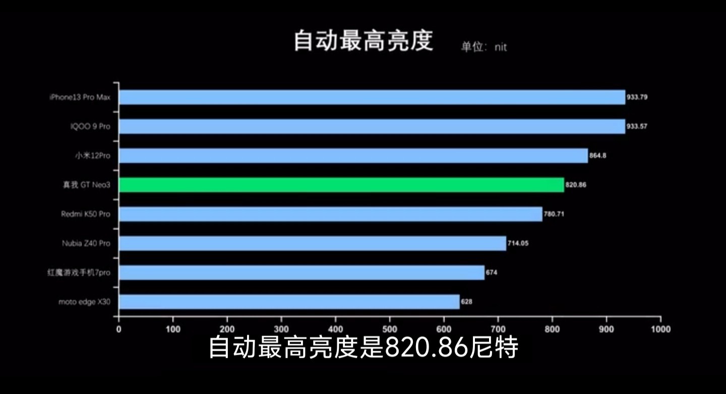真我GT Neo3上面搭载了一块京东方的1080p天马类钻屏。这次的天马屏可能会颠覆大家的认知,刚去看了测评博主 科技美学 的视频,在测试真我GT Neo3自动亮度的时候,他的亮度达到了820.86尼特,这个峰值亮度仅次于五千块钱价位的小米12pro,排在了高端机行列的第四位。