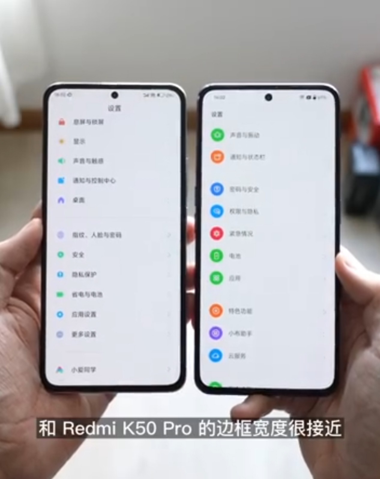 在发布之后还有网友吐槽真我GT Neo3的边框比较大,那可真是震惊到我了,估计说这些话的网友肯定没见过真机也没看过测评,科技美学 在屏占比上也做了一个实测,真我GT Neo3的屏占比达到了87.9,排在排行榜的第二名,钟文泽 博主也在视频中对比了一下,刚刚发布的红米k50pro和真我GT Neo3,两款手机的正面几乎是一模一样,都是中置打孔直屏,估计关上屏幕,这两款手机都会让人分不清。