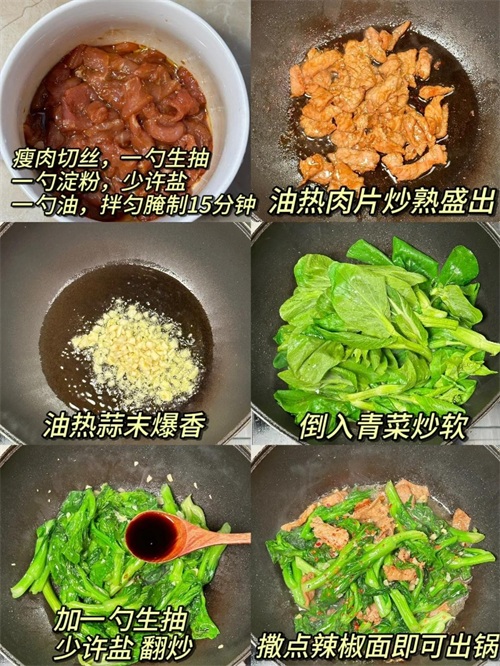 做法:1、瘦肉切丝,一勺生抽、一勺淀粉、少许盐,一勺油,拌匀腌制15分钟,油热肉片炒熟盛出;2、油热蒜末爆香,倒入青菜炒软,加一勺生抽,少许盐,翻炒,撒点辣椒面即可出锅。