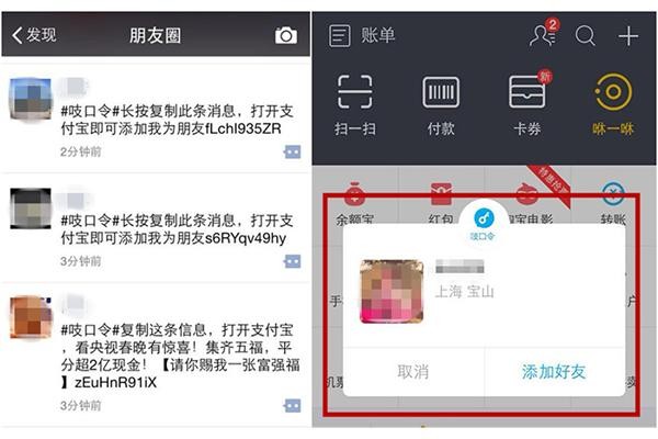 距离春节还有十天,年味儿已经越来越浓了,近来春晚相关的新闻越来越多,而作为央视猴年春晚的独家合作互动平台,支付宝也在今天做出进一步动作,推出了“吱口令”新玩法,可以让用户快速添加好友,并且在新添加10个支付宝好友后,即可获得3张福卡,而同时集齐5张福卡就能平分支付宝在春晚期间发放的2亿元大红包,看到这里估计会有不少人都开始动心了吧。