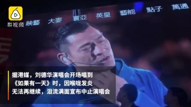 12月28日,刘德华在香港红馆自15日开始连续举行20场演唱会的第13天!不过,意外却突然发生!据现场粉丝称,刘德华仅演唱了三首歌曲不到,便中止了继续歌唱。之后,刘德华回到舞台,泪流满面的宣布中止演唱会,并说道,“医生刚刚让我最好别唱了”,之后哽咽说出,“我真的舍不得”,随即宣布中止演唱会!
