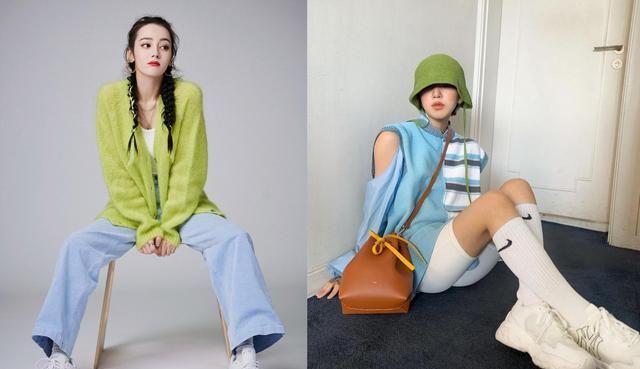蓝色和绿色属于邻近色搭配,虽没有对比色那么强烈,但在穿搭中运用的还是比较少的,可以说是很小众的一组配色。不过,今年发现很多博主、明星都在穿这组配色。