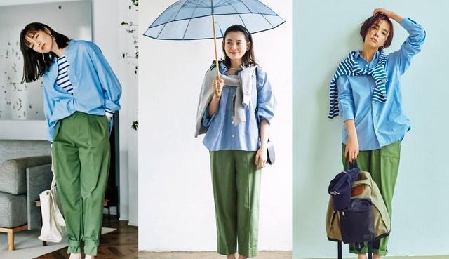 干净的冷色调蓝与充满生机的绿搭配在一起,穿好了很是清新有气质。接下来就看下具体的搭配示范吧!