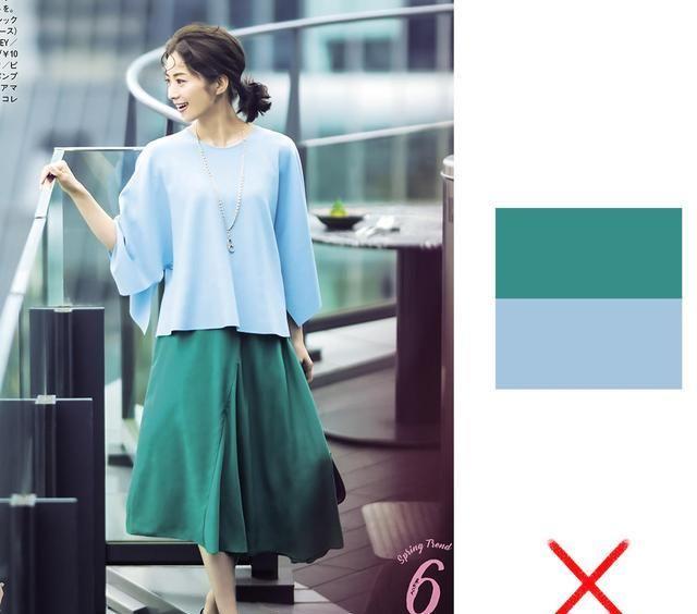 大面积使用蓝绿配色时,在色调的选择上禁忌还是比较少的。纯度、明度的不同,搭配在一起出来的风格也是不一样的。比如,同为低纯的蓝和绿搭配,柔和雅致;高纯的蓝绿配,时尚吸睛;一明一暗的组合,对比感强;一冷一暖,减龄有活力。但有一种尽量不要尝试,高明度的蓝+低纯低明的绿。因为加灰、加黑比较多的绿看起来有些脏,如果和高明度的蓝搭配,就会显得比例失调(如最左图)。
