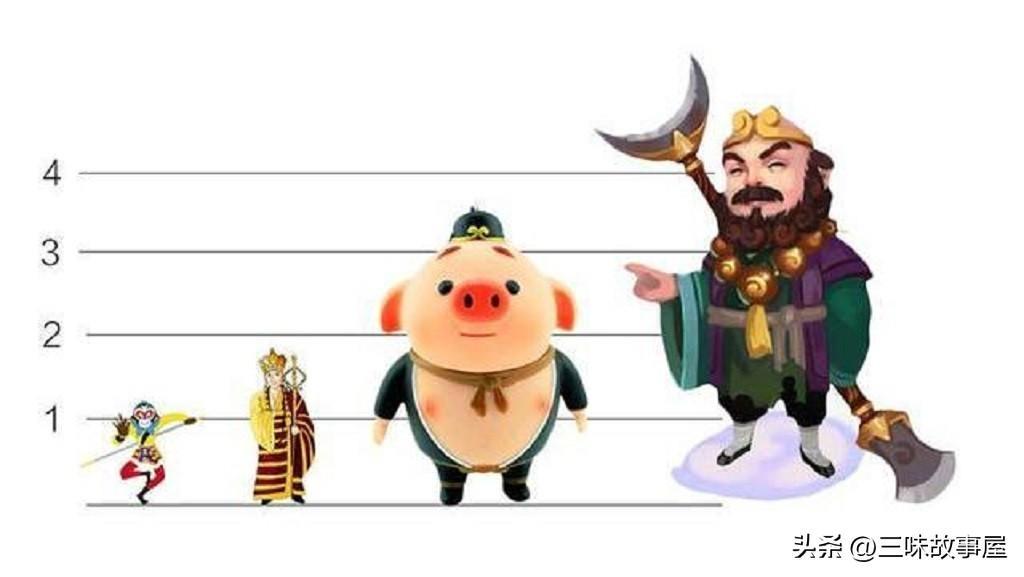 另外,原著中师徒四人的身高对比也极其强烈,唐僧的身高一米七左右,但孙悟空的身高却不足四尺,还不到一米三,沙僧身高丈二,接近4米,猪八戒原著中并未介绍其身高,但豹子精说他嘴长三尺五,也就是将近1米,这么长的嘴,身高差不多至少也在3米以上