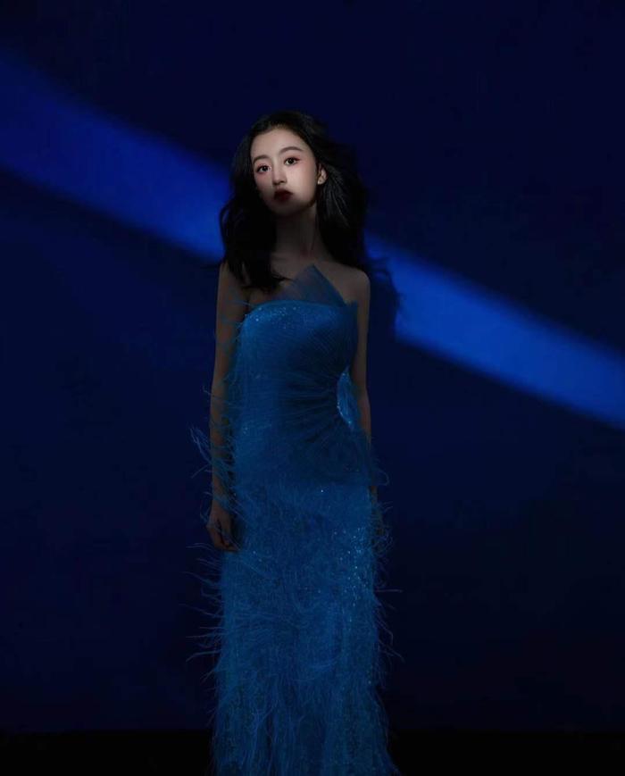 当你改变蓝色的颜色时,你突然有了不同的风格。地上的长裙勾勒出一个美丽的身影,在光影投射的瞬间,有一种感觉,裴家有一个刚刚长大的女孩。