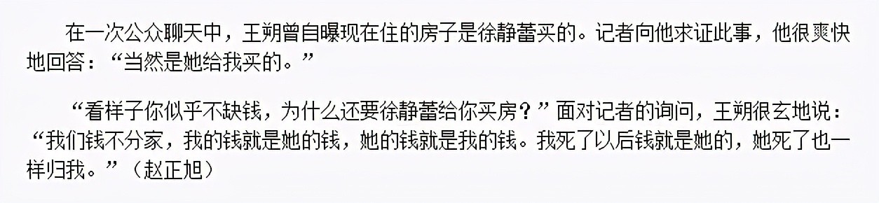 王朔也公开表示过,“我跟徐静蕾的钱不分家,我死后钱都归她。”失势后的王朔一度生活窘困,房子都租不起,徐静蕾大手一挥给他买了一个别墅。