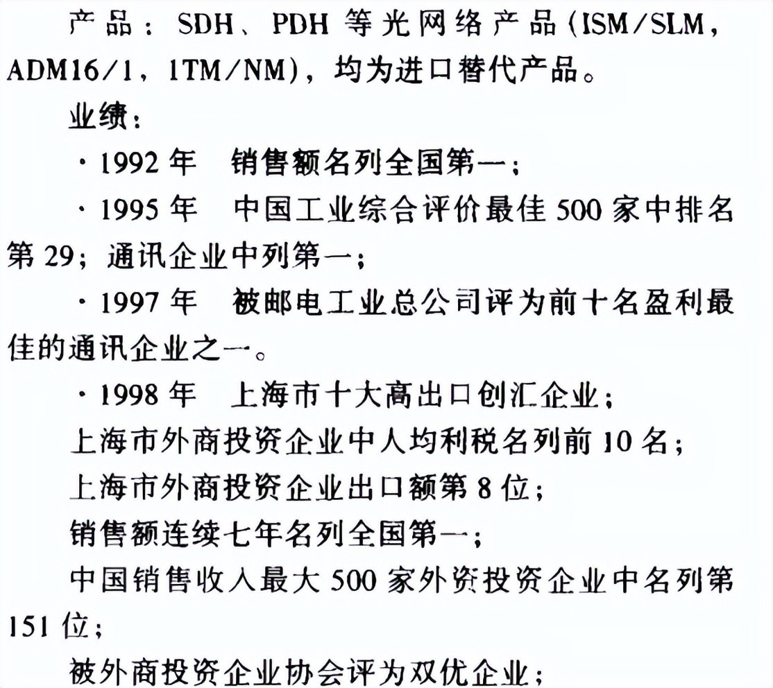 1990年3月29日:上海朗讯科技通信设备有限公司(LTOS)注册成立,朗讯科技占50%股权、上海邮电(600680)占22.5%股权、上海光通讯发展股份有限公司占21%股权、上海久事公司占6.5%股权的合资企业。业务来源100%来自朗讯科技有限公司全球区域公司的SDH/PDH采购订单1991年-2000年业绩: