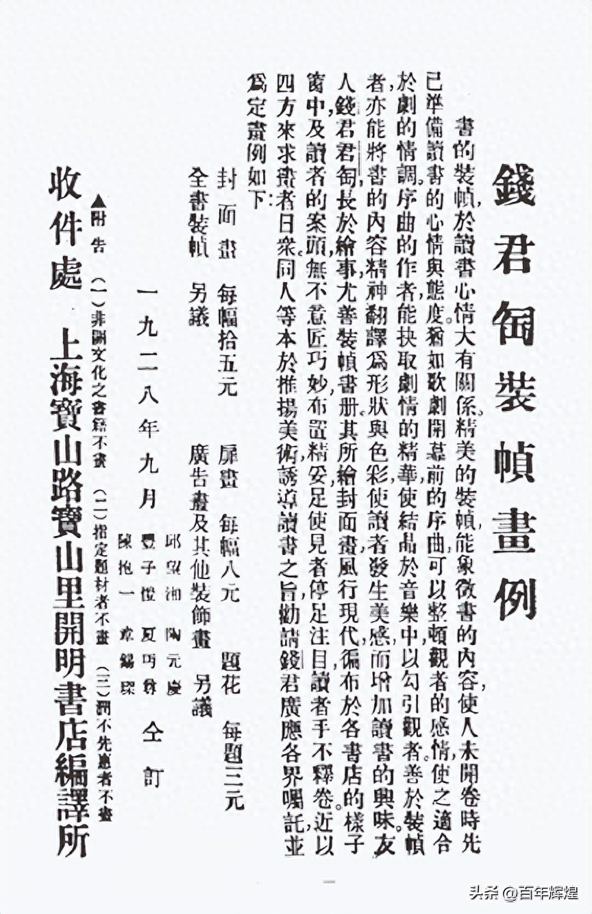……友人钱君君匋,长于绘事,尤善装帧书册。其所绘封面画,风行现代,遍布于各书店的样子窗中,及读者的案头,无不意匠巧妙,布置精妥,足使见者停足注目,读者手不释卷。近以四方来求画者日众。同人等本于推扬美术,诱导读书之旨,劝请钱君广应各界嘱托,并为定画例如下: