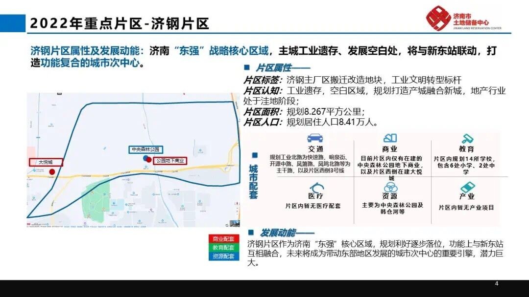 这个老工业区打造了济钢森林公园,与此同时,这里还释放出了体量不小的居住用地、商业商务用地,并开启供地高峰期。