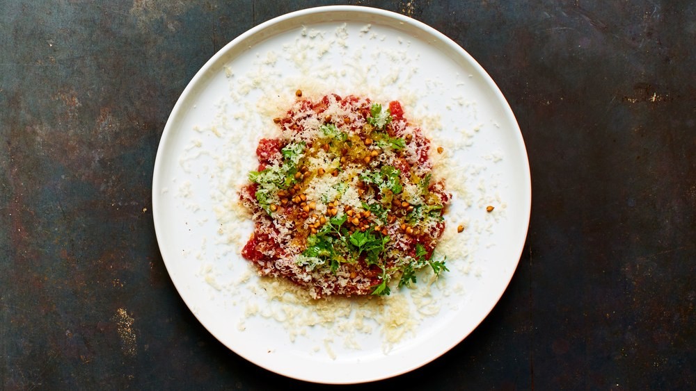 纽约餐厅 Contra and Wildair 主厨 Jeremiah Stone 就在鞑靼牛肉里头加烟熏切达起司和西红柿果酱。「这样吃起来有 BBQ 的感觉。」Stone 说:「这只是因为有天我吃了烟熏切达起司,但味道不足,所以我们又给它烟熏了一下,我觉得这和牛肉会很搭。」