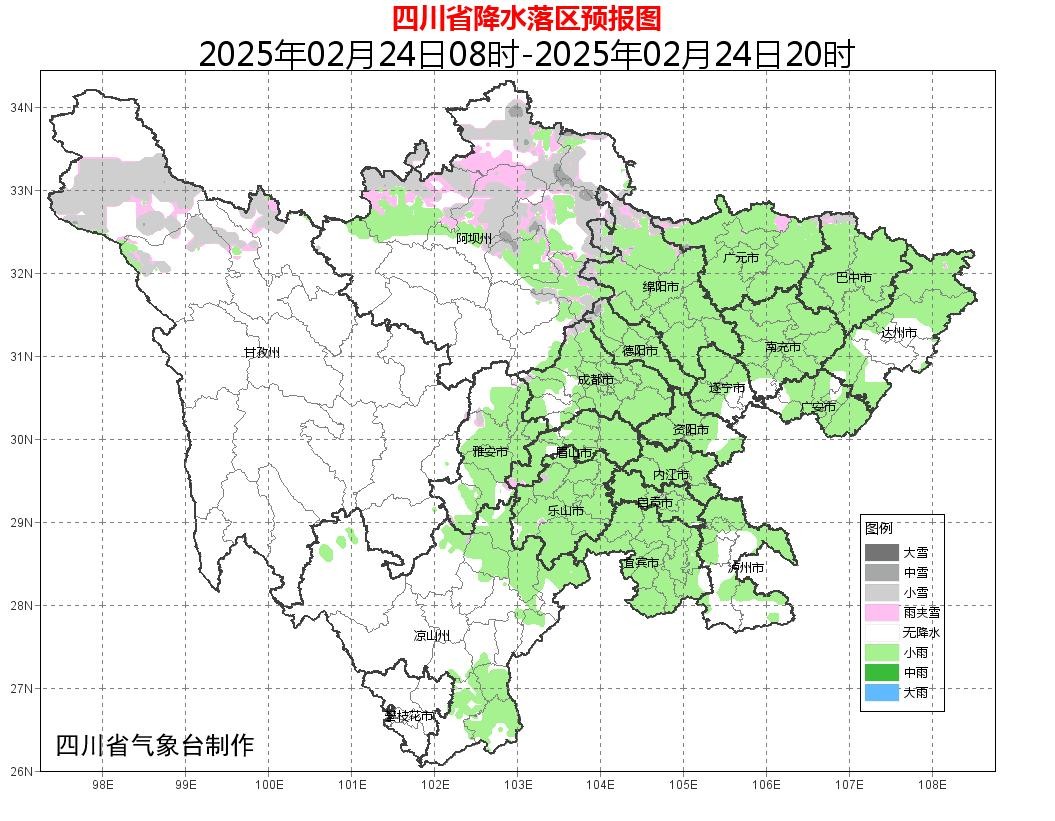 今天白天:盆地大部阴天有小雨或零星小雨,高海拔地区有雨夹雪或小雪;阿坝州北部东部、甘孜州西北部和凉山州东部阴天间多云有分散阵雪(雨),川西高原和攀西地区其余地方多云间晴。
