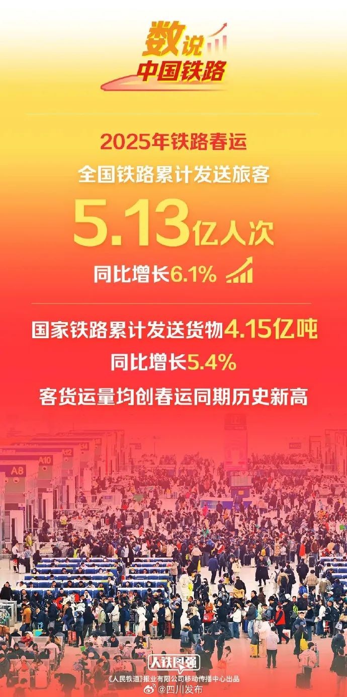 2月22日,为期40天的2025年铁路春运圆满收官,运输安全平稳有序,全国铁路累计发送旅客5.13亿人次,同比增长6.1%,国家铁路累计发送货物4.15亿吨,同比增长5.4%,客货运量均创春运同期历史新高。(中国铁路)