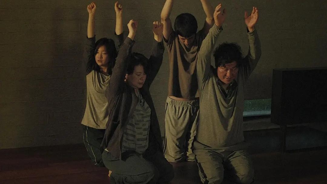 相对于基宇一家来说,保姆一家生活的更加不易,保姆的老公生活在暗无天日的地下室里,无法到地面上去,像蝼蚁一样苟活。外有债主,内有难言之隐,他们像寄生虫一样从富人身上吸取养分。导演通过荒诞戏剧式的叙事手法,再现了底层群体的生存现状,无法跨越的阶级背后也是对现实社会的批判和讽刺。