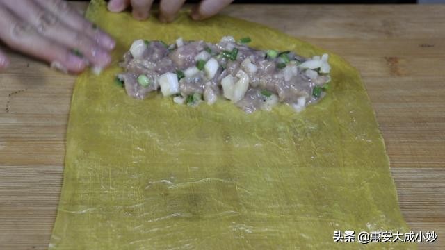 4、豆皮摊平,抓取适当的肉料均匀铺成一条,卷起后在豆皮末端涂上清水,提供黏性。最后头尾两侧也摸上水压紧;