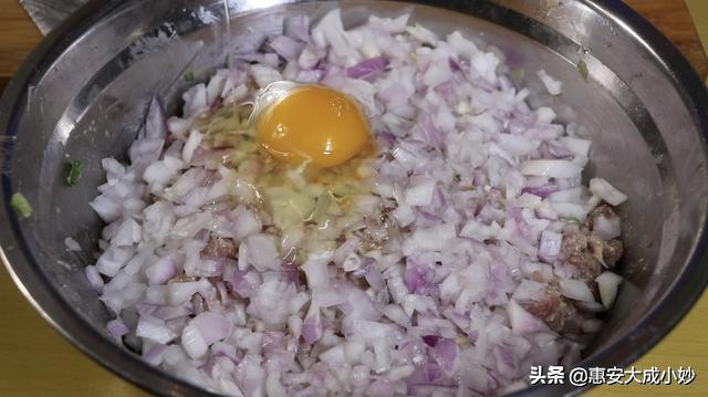 2、洋葱切成粒,倒进腌好的猪瘦肉,打入鸡蛋,再加上农家的地瓜粉,拌匀至无颗粒;