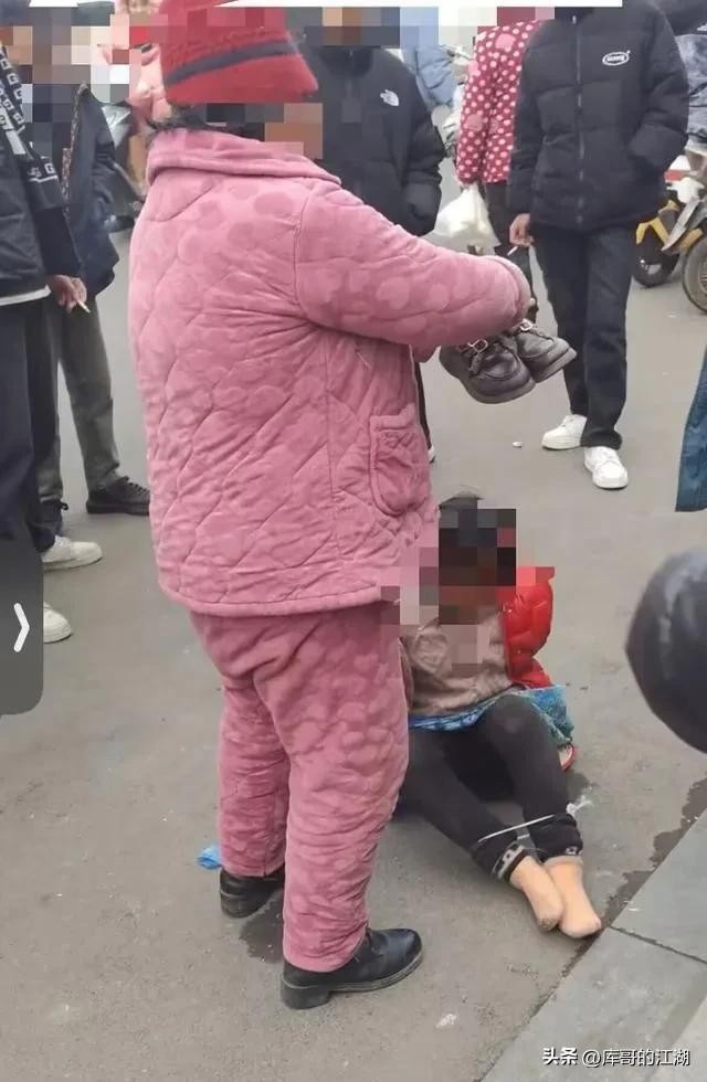 发布视频者配文称,女孩子被这位大妈手脚捆绑要放在电动车后座上,孩子要逃跑跳下电动车,大妈将其按倒在地上,引来群众围观,已经报警。