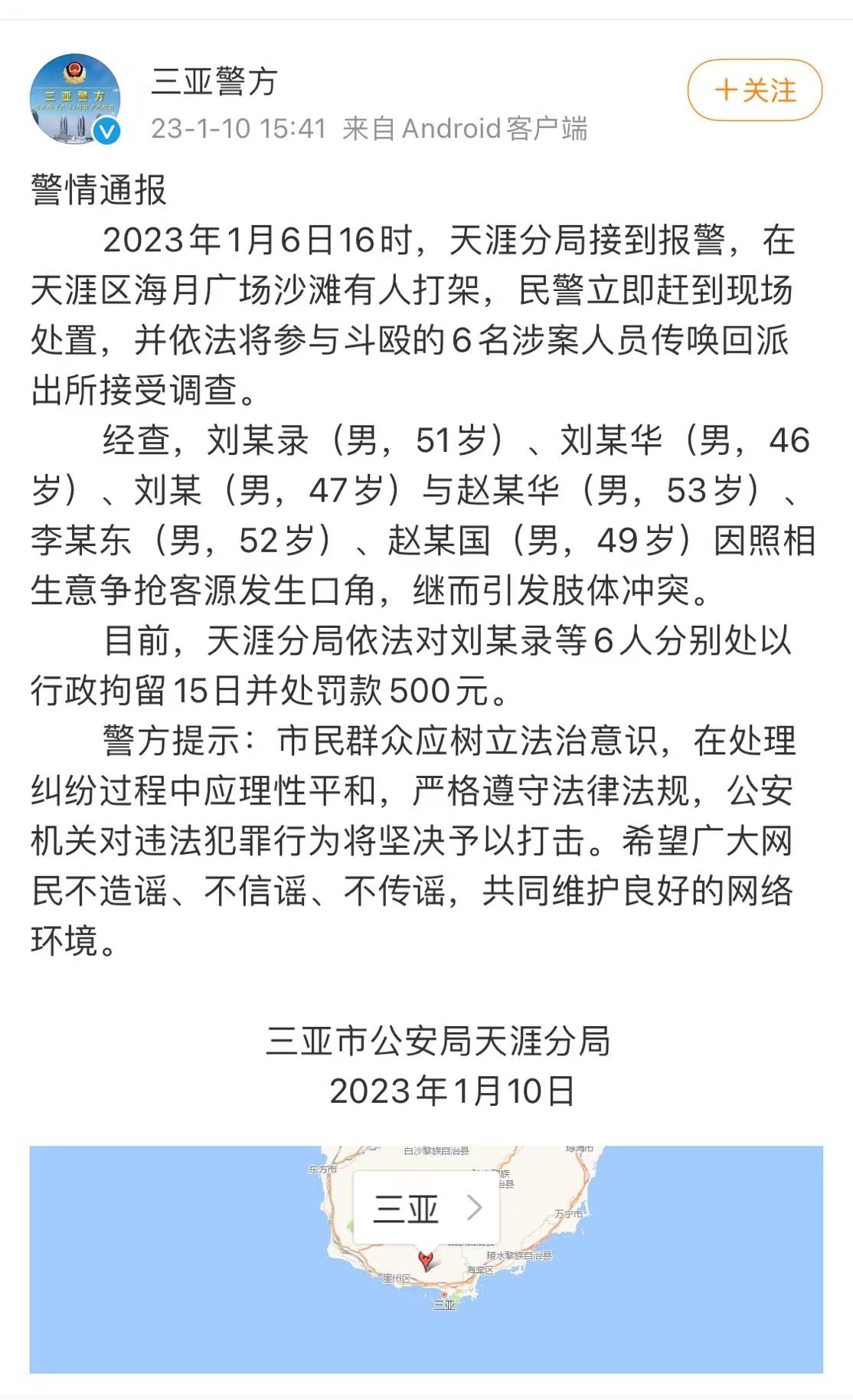 1月10日,@三亚警方 发布通报:2023年1月6日16时,天涯分局接到报警,在天涯区海月广场沙滩有人打架,民警立即赶到现场处置,并依法将参与斗殴的6名涉案人员传唤回派出所接受调查。