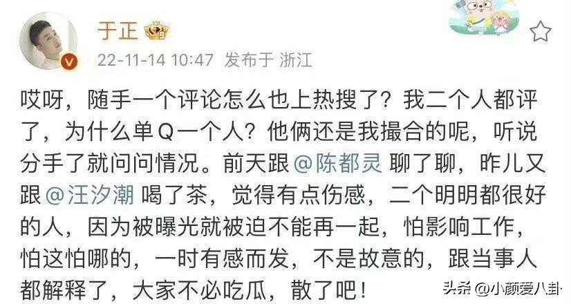 其实,汪汐潮跟陈都灵的恋情,双方当事人并没有明面上公开过,但却被于正给挑在了台面上,也算是证实了两人交往过的事实。