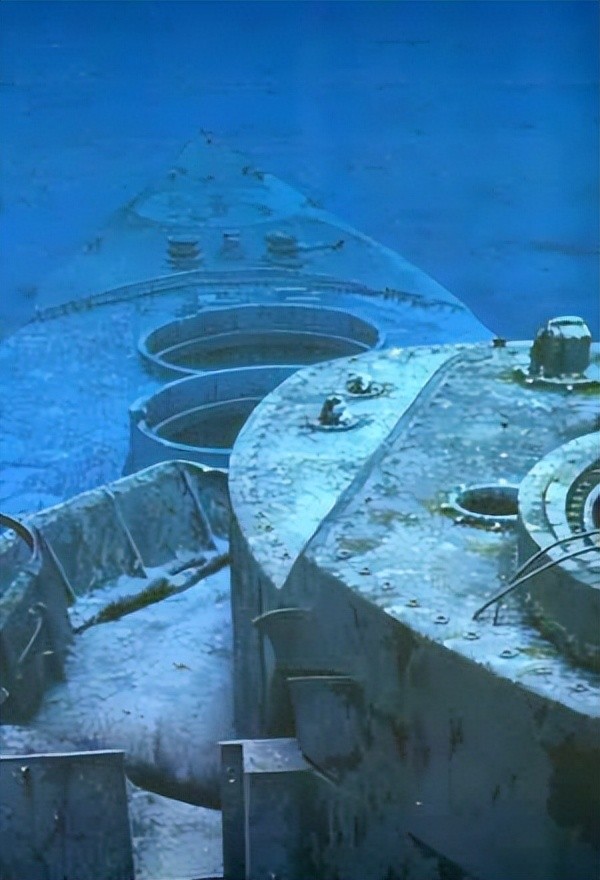 俾斯麦号战列舰的残骸的全景,舰上的主炮炮塔都已失踪,因为在下沉时发生脱落。