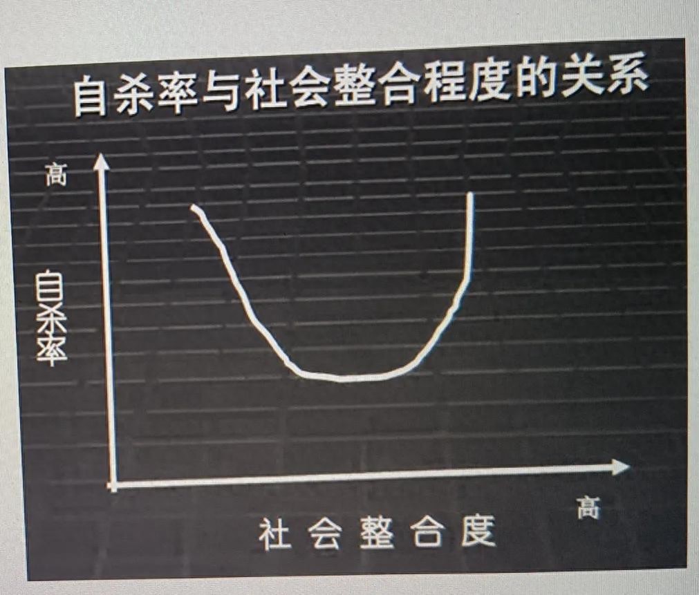 什么是社会的整合程度?通俗来说,就是人与人之间的亲密程度。比如,在许多农村地区,邻里、亲戚之间经常相互走动,广结善缘,大家经常串门、聚餐、互相帮忙,这就是一种整合程度比较高的社会。而在一些城市中,有的人除了上班就是一个人呆在家里,不社交、不谈朋友、不结婚,他与社会的关联就比较弱,一个地方这样的人多了,社会的整合程度就比较低了。根据迪尔凯姆的结论,较高整合程度的地方,人们就不容易自杀,而人与人之间比较淡漠、相对独立的地方,人更容易自杀。但他也提出,整合程度过高的社会形态中,自杀率也会提高(利他主义的自杀)。具体关系如图所示。这又是为什么呢?