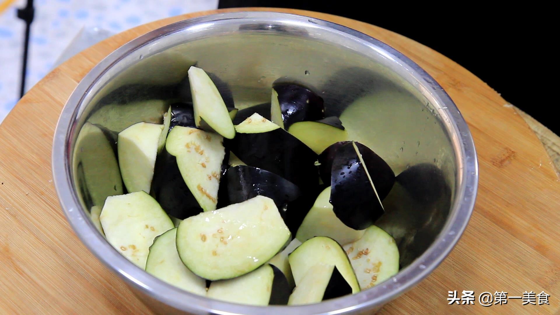 紫茄子一个切去根部,切成滚刀块,放在盆中。