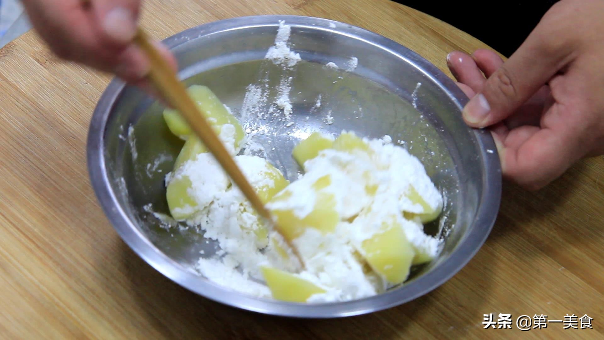 然后放在盆中加入玉米淀粉拌匀,土豆外皮裹匀淀粉,炸出来外皮更酥脆。