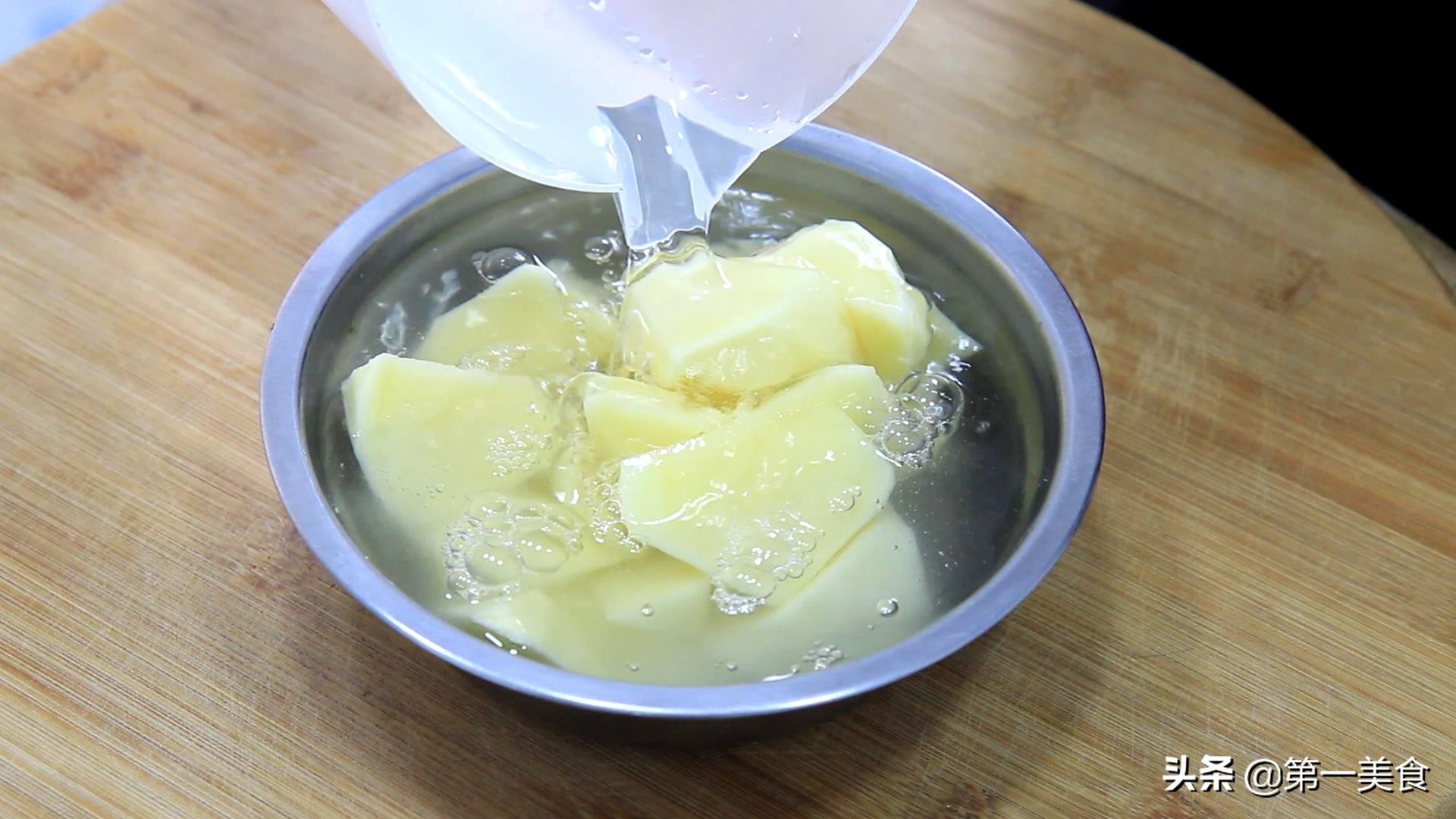 首先,我们准备一下食材,土豆一个,削去外皮切成滚刀块,放在盆中倒入清水浸泡,防止土豆氧化变色。