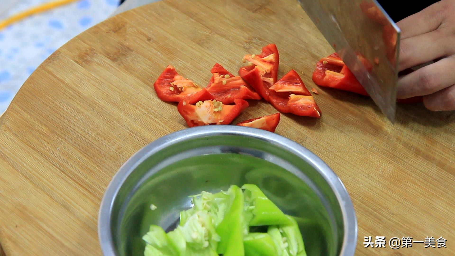 青椒一个切成滚刀块,红椒一个也切成滚刀块放在盆中。