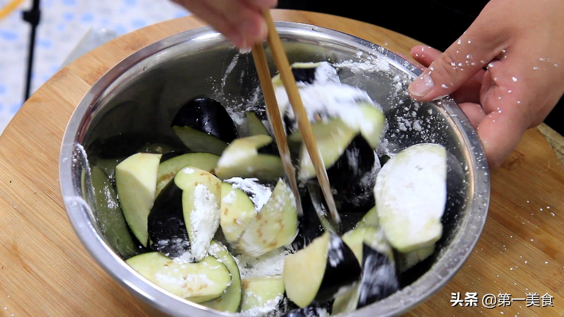 在茄子里面加入白醋2克,加入白醋可以防止茄子被氧化变黑,倒入玉米淀粉,用筷子搅拌均匀备用。