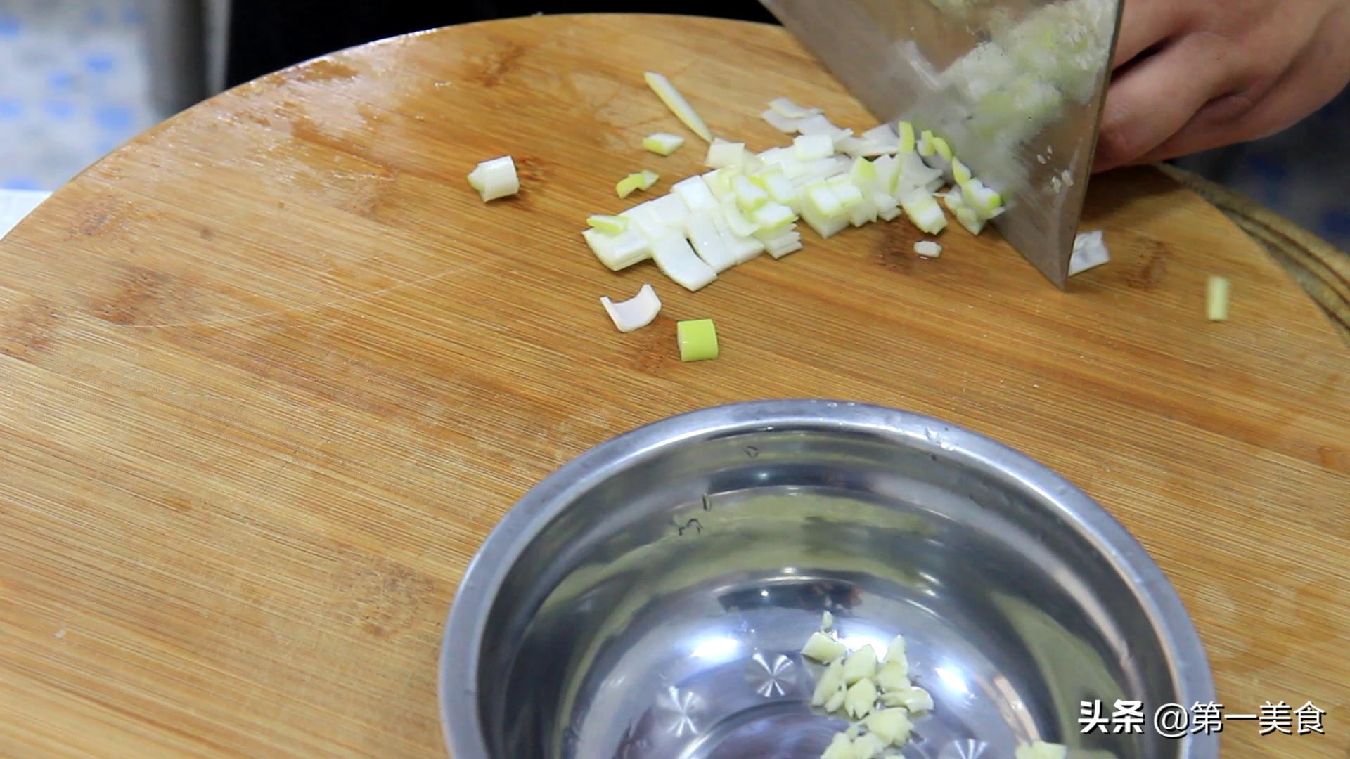 大蒜拍扁剁成蒜末,大葱皮开切成葱花。