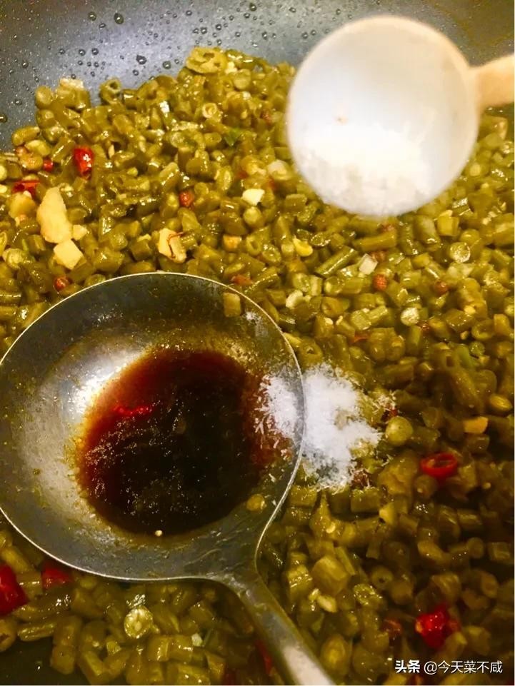 一、酸豆角本身有咸味,加入酱油后不需要再放盐。放入味精鸡精调味提鲜即可。