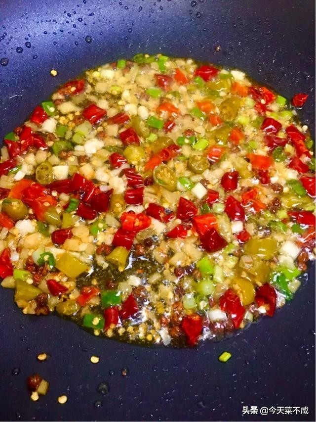 2、炒锅上火放入底油,放入猪肉末炒至变色,放入花椒、干辣椒、野山椒、泡椒、葱姜蒜爆香。