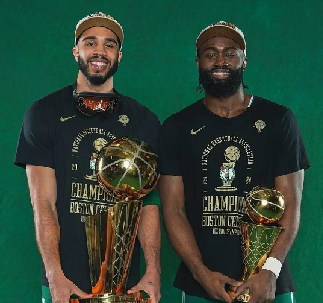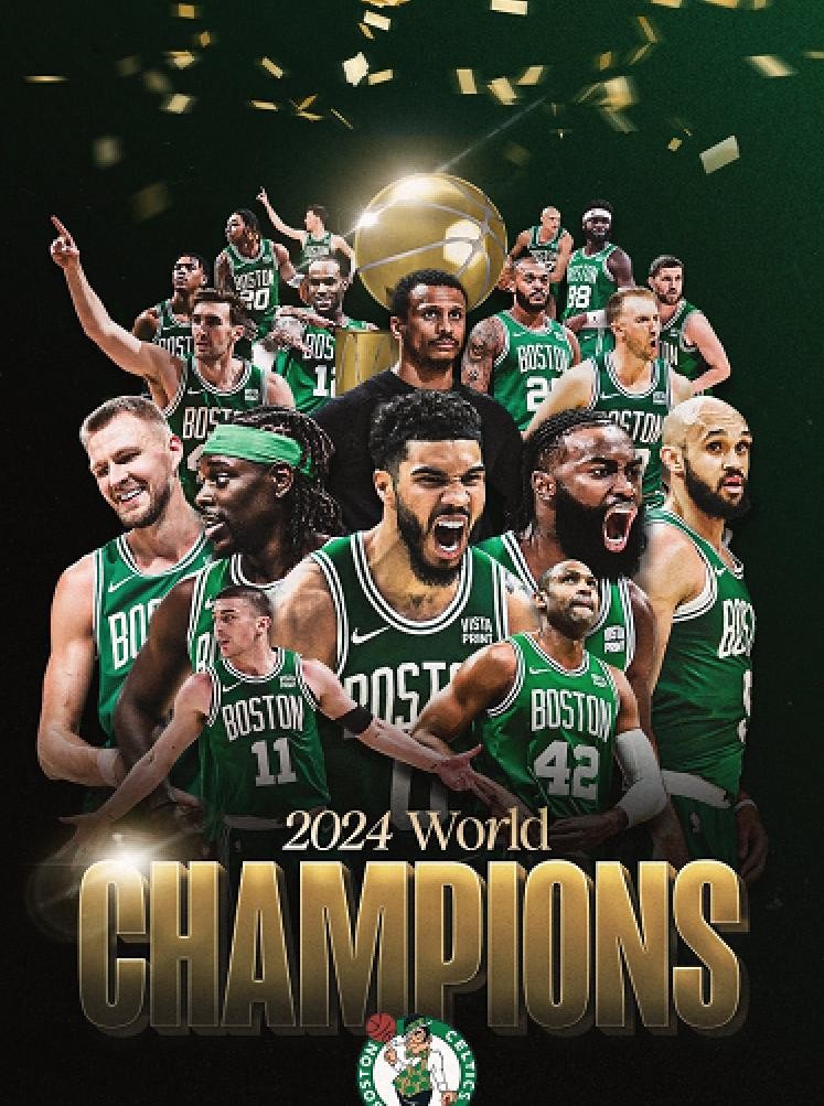 凯尔特人捧起队史第18座总冠军奖杯,创下季后赛16胜3负的傲人战绩,杰伦布朗继东决MVP后又斩获FMVP,塔图姆和霍福德也圆梦。