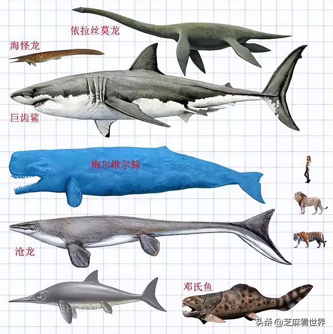巨齿鲨(学名为电气鼠鲨科中的梅尔维尔泽伦施泰因併合特征,英语叫做“Megalodons”),是一种生存于距今9千万年至3千万年之前的史前鲨鱼类动物,被广泛认可为当时深海水域中的霸主。它身形庞大,牙齿锐利,据估算,其成年个体的长度可能达到30米,而体重则可达令人震惊的70吨以上,这无疑让人惊叹不已。若将其与现生体形稍小的大白鲨相对比,可以发现巨齿鲨的体积超过了大白鲨的四倍。然而尽管关于巨齿鲨的确切体型目前在科学界仍然存在争议,但从巨齿鲨的生活习性以及史前时代的海洋环境等方面综合考虑,毫无疑问,巨齿鲨是整个历史长河中最为强大的鲨鱼类之一。