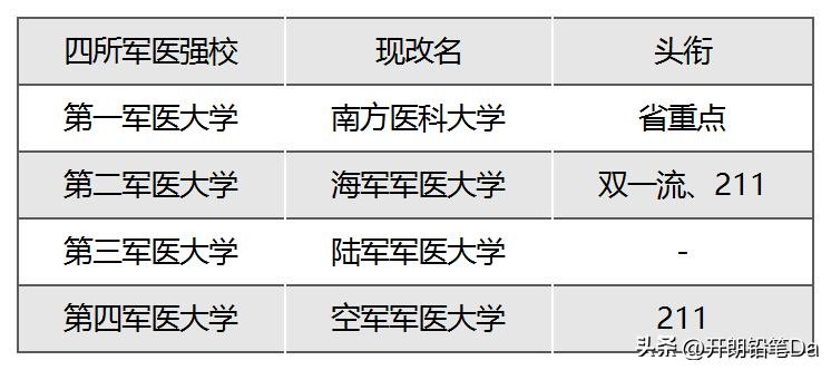 四所军医大学的第一军医大学现在是广东省省属高校,改名为南方医科大学,是一所全国重点的医科大学。在这四所军医强校中的第二军医大学、第四军医大学也入选世界一流学科建设高校,不过这四所军医大学都改名了新校名,具体如下: